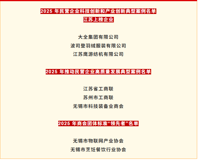 會(huì)上,發(fā)布了2025研發(fā)投入前1000家民營(yíng)企業(yè)創(chuàng)新狀況報(bào)告和民營(yíng)企業(yè)研發(fā)投入、發(fā)明專利榜單,民營(yíng)企業(yè)發(fā)展新質(zhì)生產(chǎn)力系列典型案例、商會(huì)團(tuán)體標(biāo)準(zhǔn)“領(lǐng)先者”名單。其中,江蘇77家民營(yíng)企業(yè)入圍“2025民營(yíng)企業(yè)研發(fā)投入500 家”、62家民營(yíng)企業(yè)入圍“2025民營(yíng)企業(yè)發(fā)明專利500 家”;大全集團(tuán)有限公司、波司登羽絨服裝有限公司、江蘇鷹游紡機(jī)有限公司3家企業(yè)入選“2025年民營(yíng)企業(yè)科技創(chuàng)新和產(chǎn)業(yè)創(chuàng)新典型案例名單”;江蘇省工商聯(lián)、蘇州市工商聯(lián)、無錫市科技裝備業(yè)商會(huì)3家單位入選“2025年推動(dòng)民營(yíng)企業(yè)高質(zhì)量發(fā)展典型案例名單”;無錫市物聯(lián)網(wǎng)產(chǎn)業(yè)協(xié)會(huì)、無錫市烹飪餐飲行業(yè)協(xié)會(huì)2家商會(huì)標(biāo)準(zhǔn)入選2025年商會(huì)團(tuán)體標(biāo)準(zhǔn)“領(lǐng)先者”名單。江蘇上榜企業(yè)和單位數(shù)量均位居前列。